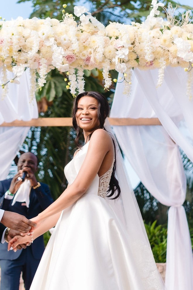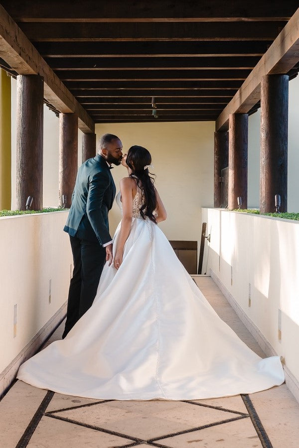 This simple yet romantic bridal gown features a classic V-neckline, an illusion back with crystals details. A-line satin skirt with a dramantic train. It can be custom made to your exact measurements. *Colors may photograph differently under studio lighting. Custom size is recommended, totally free. If you can't find the color you want above, please write your color or your custom made measurements in the checkout step, or send us your color image and measurements through email. You can click ASK A QUESTION.
