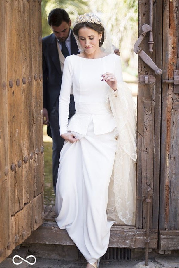 Full Sleeves White Sheath Bridal Dresses with Peplum